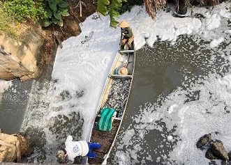 - Nước thải có màu đen ngòm, chưa qua xử lý đổ tràn ra sông Cẩm Lệ (thành phố Đà Nẵng), bốc mùi hôi.