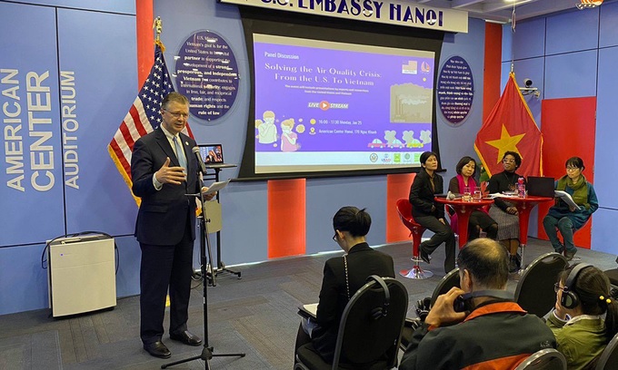 Đại sứ Daniel Kritenbrink phát biểu tại tọa đàm về chất lượng không khí tại trụ sở Trung tâm Mỹ ở Hà Nội chiều 25/1. Ảnh: Đại sứ quán Mỹ.