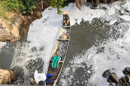 - Nước thải có màu đen ngòm, chưa qua xử lý đổ tràn ra sông Cẩm Lệ (thành phố Đà Nẵng), bốc mùi hôi.